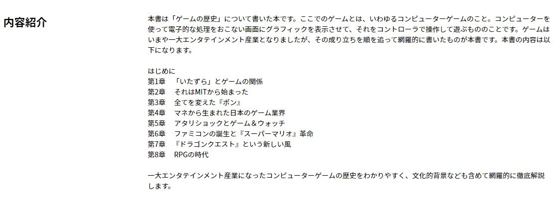 前書きによると同書はコンピュータゲームの成り立ちを順を追って網羅的に書いたもの。著者たち独自の視点「岩崎・稲田史観」に基づいて、任天堂のゲーム機、ファイナルファンタジーVIIが業界に与えたインパクト、3D表現の進化、業界動向などについて語っている。