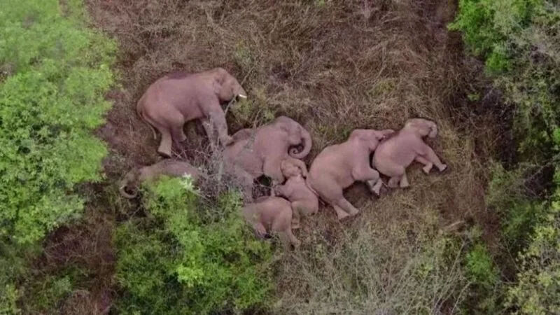 中国で生息地を離れて北上を続けていたゾウの群れが、そろって昼寝をしている様子が撮影された。山西省昔陽県の近くの森で、大雨が続いたために長旅を一時中断したものと思われる。